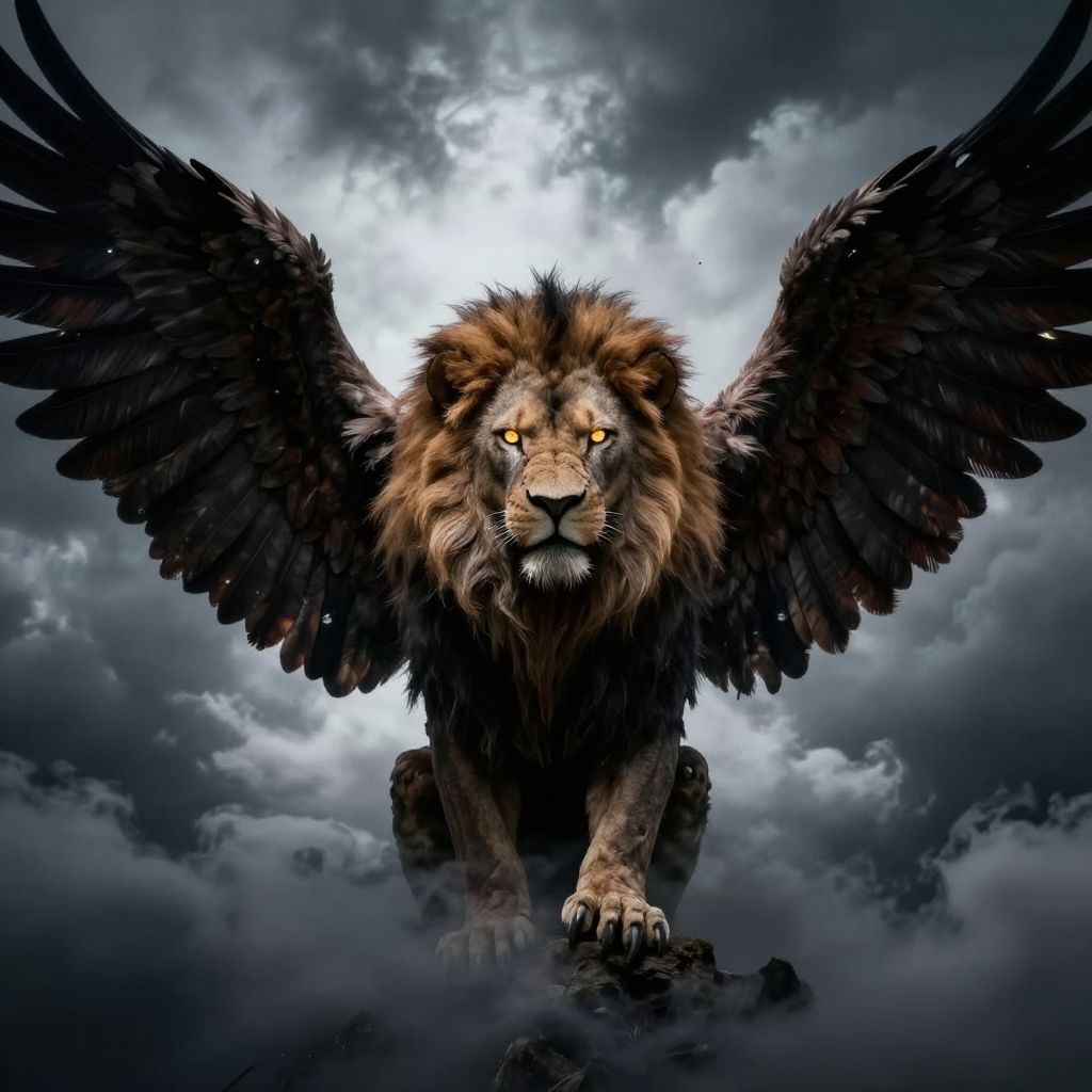 Lion head eagle body powerful guardian with glowing eyes, wings spread wide, stormy clouds behind, dark fantasy style, high contrast, ultra detailed creature design