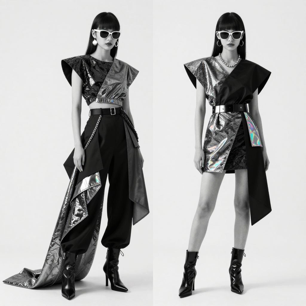 Midjourney fashion editorial featuring avant-garde designs, asymmetrical cuts, metallic fabrics, and holographic accessories in a high-contrast monochrome studio setting, emphasizing innovation and modernity in wearable art.