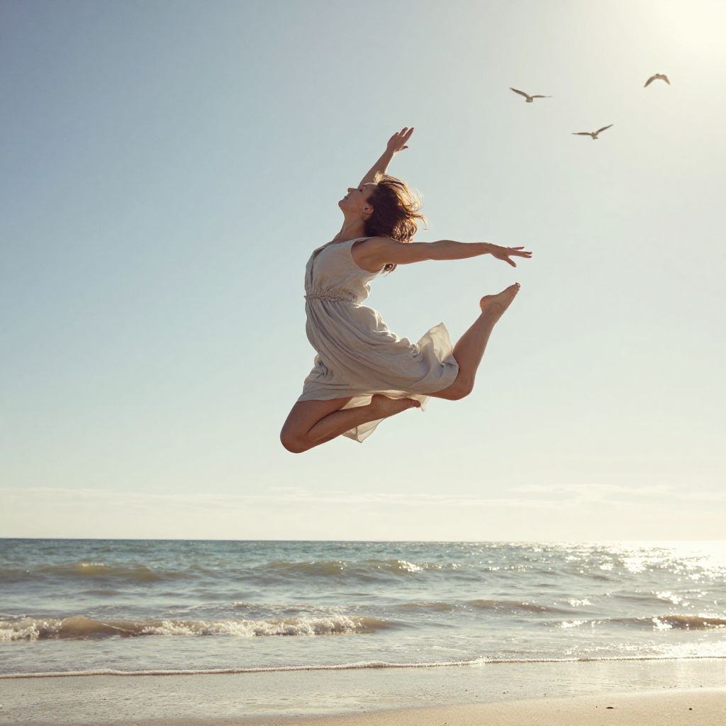 Amidst a symphony of soaring birds and shimmering sunlight, a woman leaps into the air, her flowing dress and outstretched arms embodying the ethereal dance of freedom and transcendence, while the gentle whispers of the ocean below echo the timeless pursuit of liberation.
