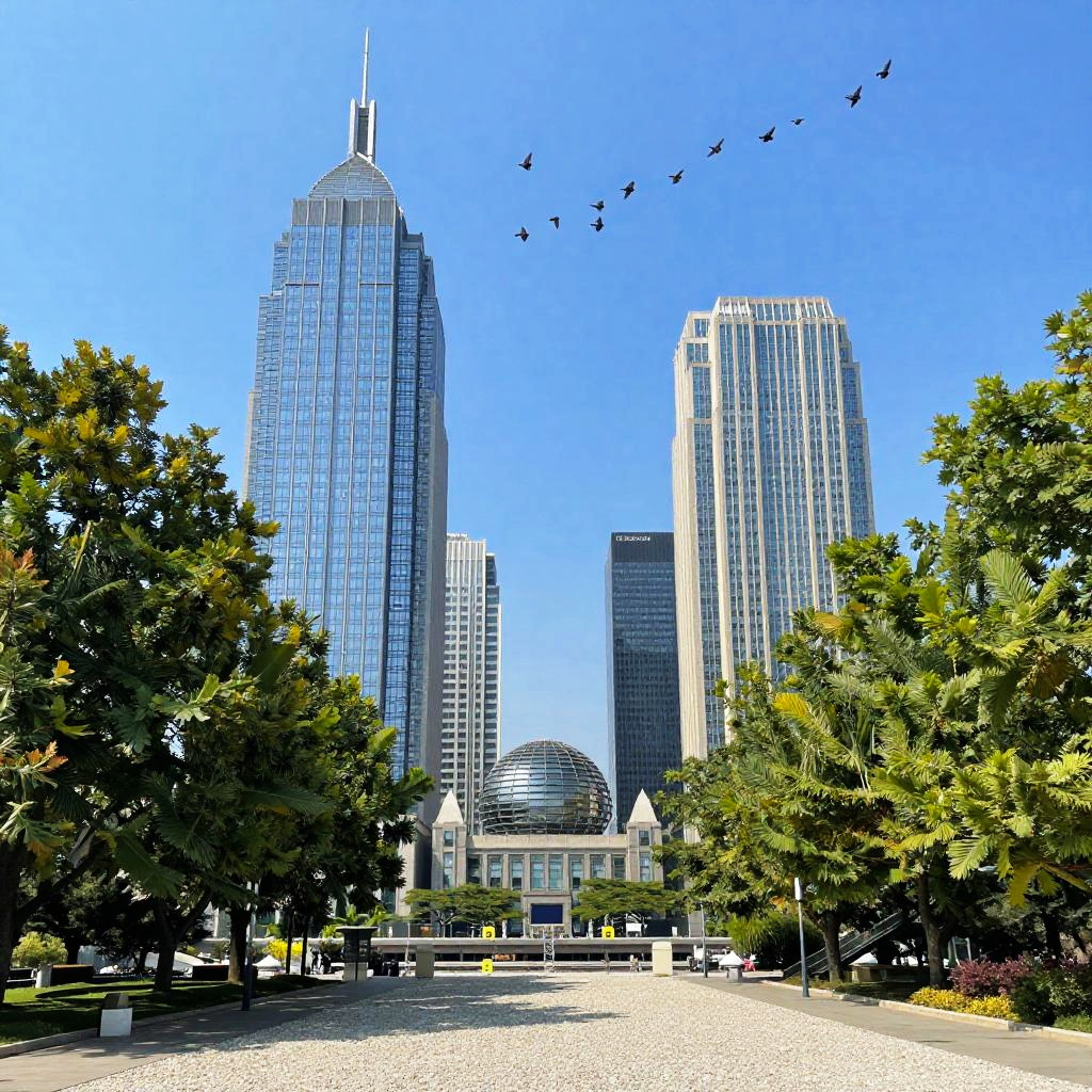 Photograph of a cityscape with a bright blue sky. Tall skyscrapers with modern glass facades and a unique dome-shaped building are in the background. In the foreground, a gravel path is flanked by lush green trees. A flock of birds is flying in a V-shaped formation across the sky. The image has a vibrant, colorful style.
