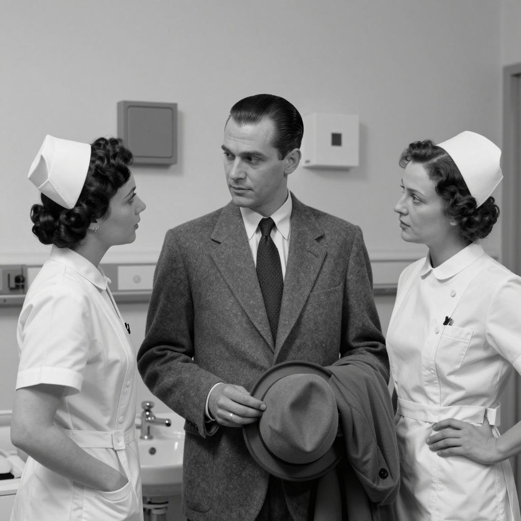 Black-and-white photograph of three women in a vintage laundry room. Two women on left, one holding a dress, the other assisting. Woman on right holds folded clothes. Arched windows in background. Mid-20th century attire. Serious expressions. Curtains and tiled walls.