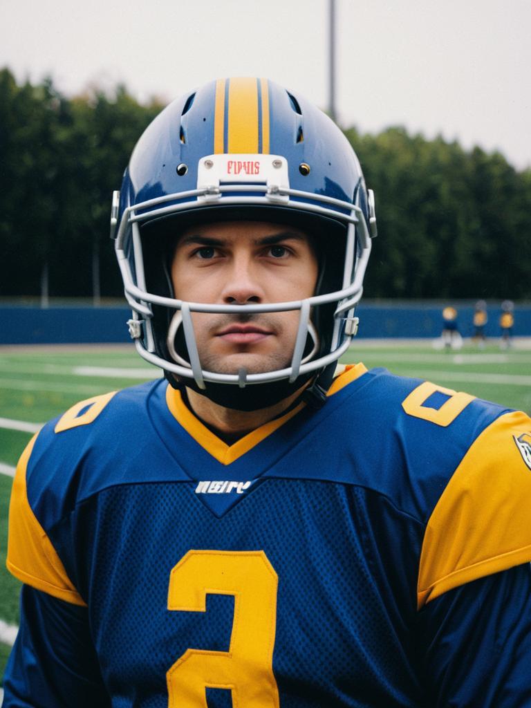 Man in Football Helmet costume, cosplay editorial portrait, cinematic realism