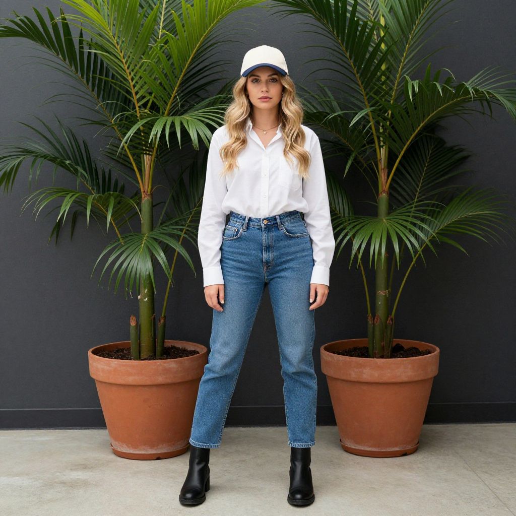 "anne wheeler costume, 1girl, solo, jeans, denim, pants, boots, blonde hair, shirt, full body, plant, standing Realistic photo of casual sexy person with pretty face"