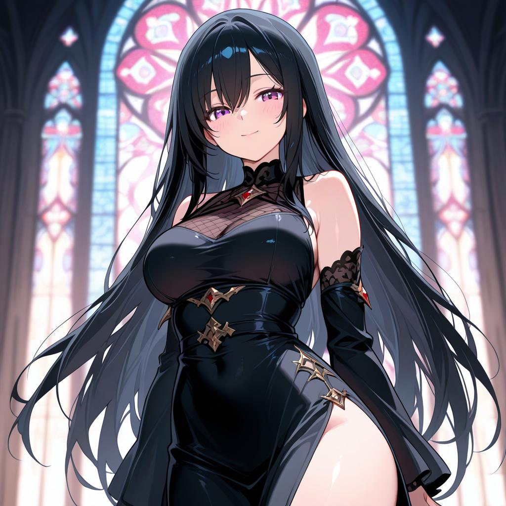 Long hair, 1girl, red eyes, open mouth, dress, solo, smile, bare shoulders, looking at viewer, breasts, detached sleeves, very long hair, black dress, sleeveless, bangs, hair between eyes, stained glass, blurry background