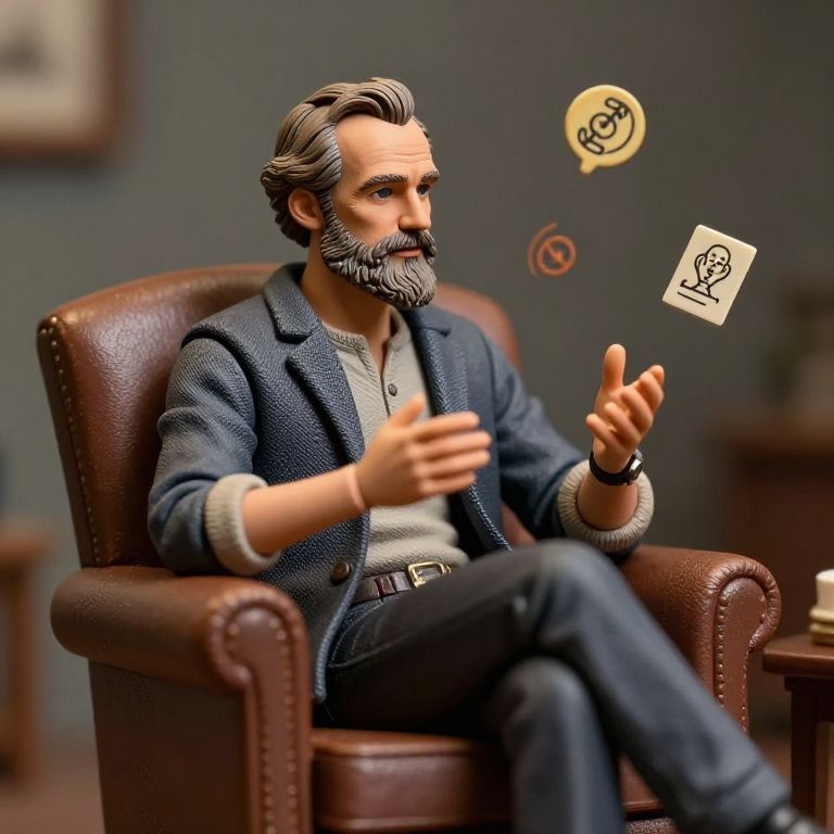 A Sigmund Freud action figure in mid-discussion pose, sitting on a classic armchair with tiny psychoanalysis symbols floating around, hyper-realistic design with textured hair and fabric clothing, soft ambient lighting, modern collector’s edition aesthetic.