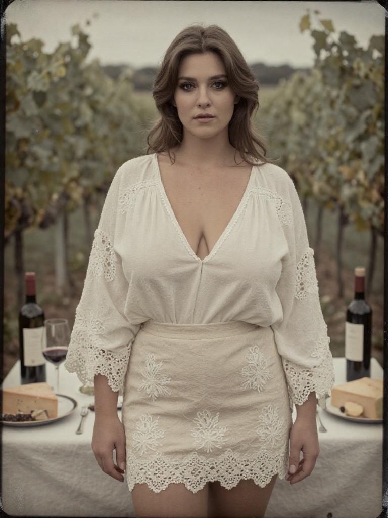 A Stocky woman, in a bohemian oversized cream blouse with a plunging V-neck and a cream mini skirt, adorned with intricate lace embroidery, stands at a Wine and Cheese Tasting in a Rustic Vineyard, captured in the soft, ethereal tones of the Calotype process. Sexy. Pretty face and beаutiful eyes. Big breasts