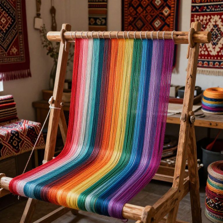 Spun yarn in vibrant rainbow colors cascading down a rustic wooden loom, surrounded by cozy and warm textile patterns, illuminating the artisanal craft of weaving in a charming workshop setting.