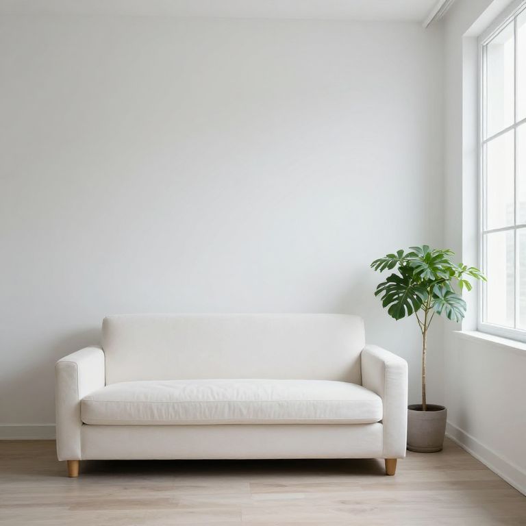 Photograph of a minimalist living room featuring a white, cushioned sofa with wooden legs positioned against a plain white wall. To the right of the sofa, a potted green plant with broad leaves sits near a large window, allowing natural light to flood the room. The floor is light wood, adding warmth to the otherwise stark, clean space. The window has white frames and multiple small panes. The overall composition is simple and modern, emphasizing clean lines and a serene atmosphere.