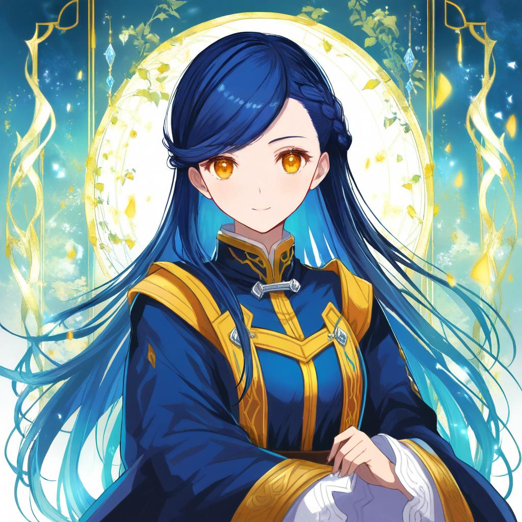 This digital anime-style illustration features a young woman with long, dark blue hair and golden amber eyes. She wears a navy blue and gold-trimmed traditional outfit with white cuffs, resembling a fantasy or medieval attire. Her expression is calm and slightly melancholic. A glowing, circular halo with golden accents surrounds her head, set against a blue and white gradient background with sparkling light effects. Golden, vine-like patterns frame the top and sides of the image. The overall style is vibrant and detailed, with a focus on the character's serene yet enigmatic presence.