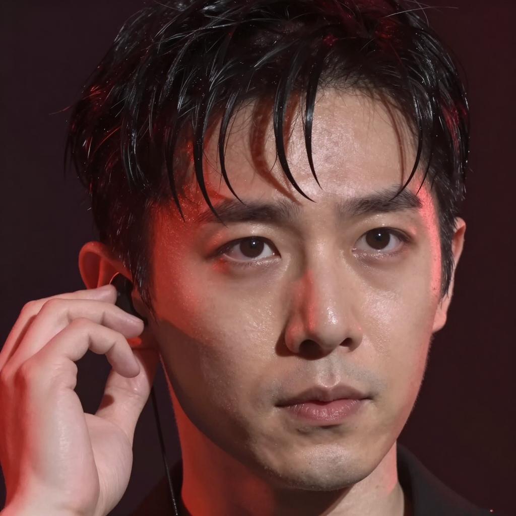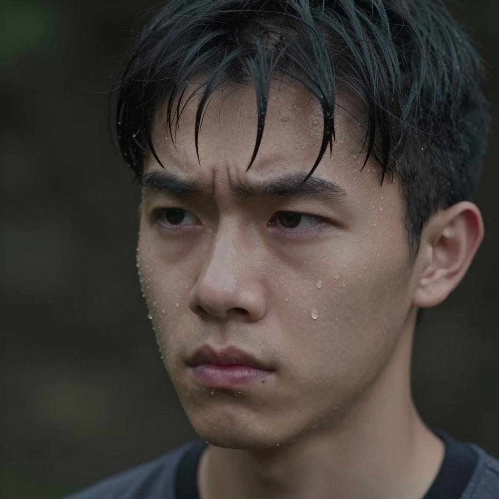 Close-up photograph of a man's face with intense, focused eyes. Dark, wet, disheveled hair covers his forehead. Light brown skin with visible pores and slight sweat. Mouth slightly open, expression serious. Dark background. Only face visible.