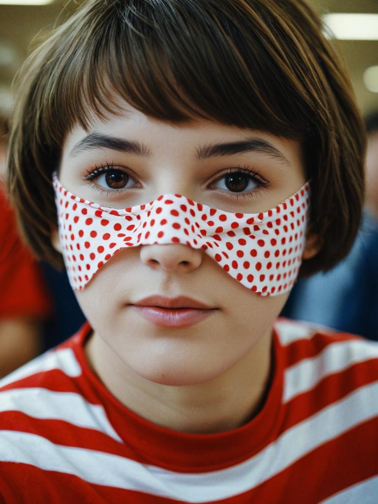 Close-up portrait of a young girl with short brown hair wearing a red and white striped shirt and a white face mask with red polka dots. The girl is looking directly at the camera with a neutral expression, set against a blurred background. The costume is inspired by the character Where's Wally.