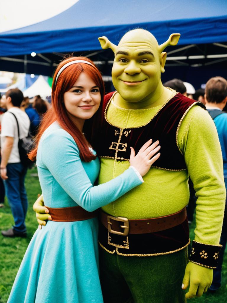 Couple in Shrek and Fiona Costumes, candid cosplay portrait at festival
