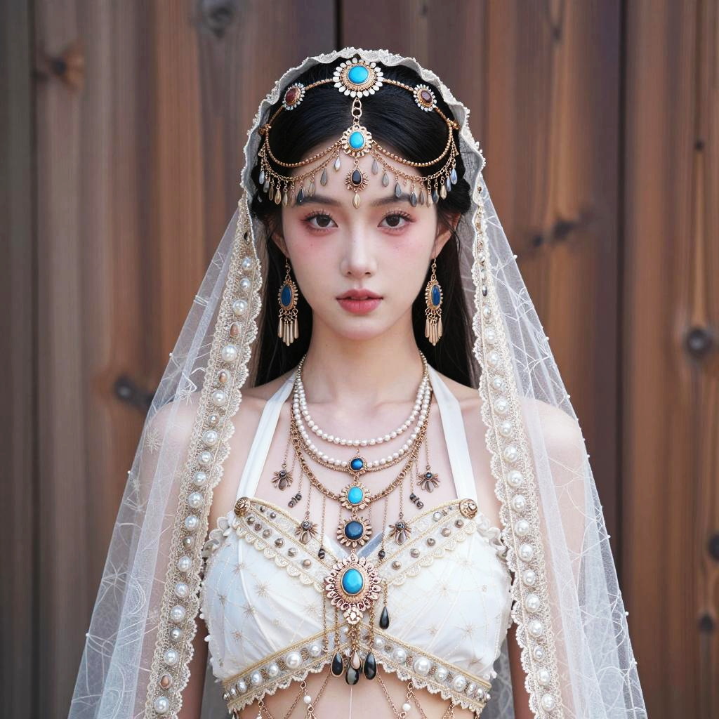 The woman in the image is dressed in an elaborate costume featuring a turquoise and gold embellished top and matching skirt. She accessorizes with statement earrings and a jeweled tiara, and her long wavy hair frames her face beautifully, highlighting her confident and poised expression.