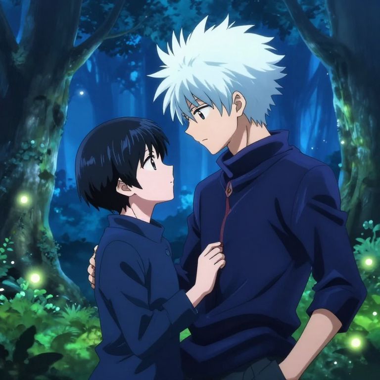 Are Killua and Gon boyfriends depicted in a vibrant anime-style scene, showcasing deep friendship with subtle romantic undertones, soft pastel colors, emotional expressions.