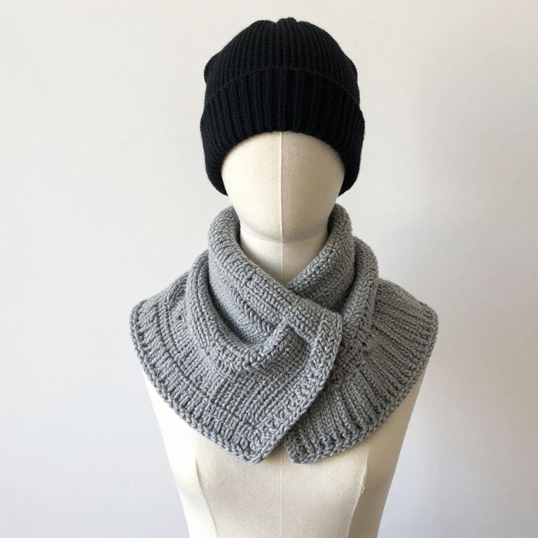 Knitted ensemble featuring a black beanie atop a mannequin head, paired with a gray cowl-style scarf wrapped in a bow-like design, showcasing intricate crochet patterns and textures.