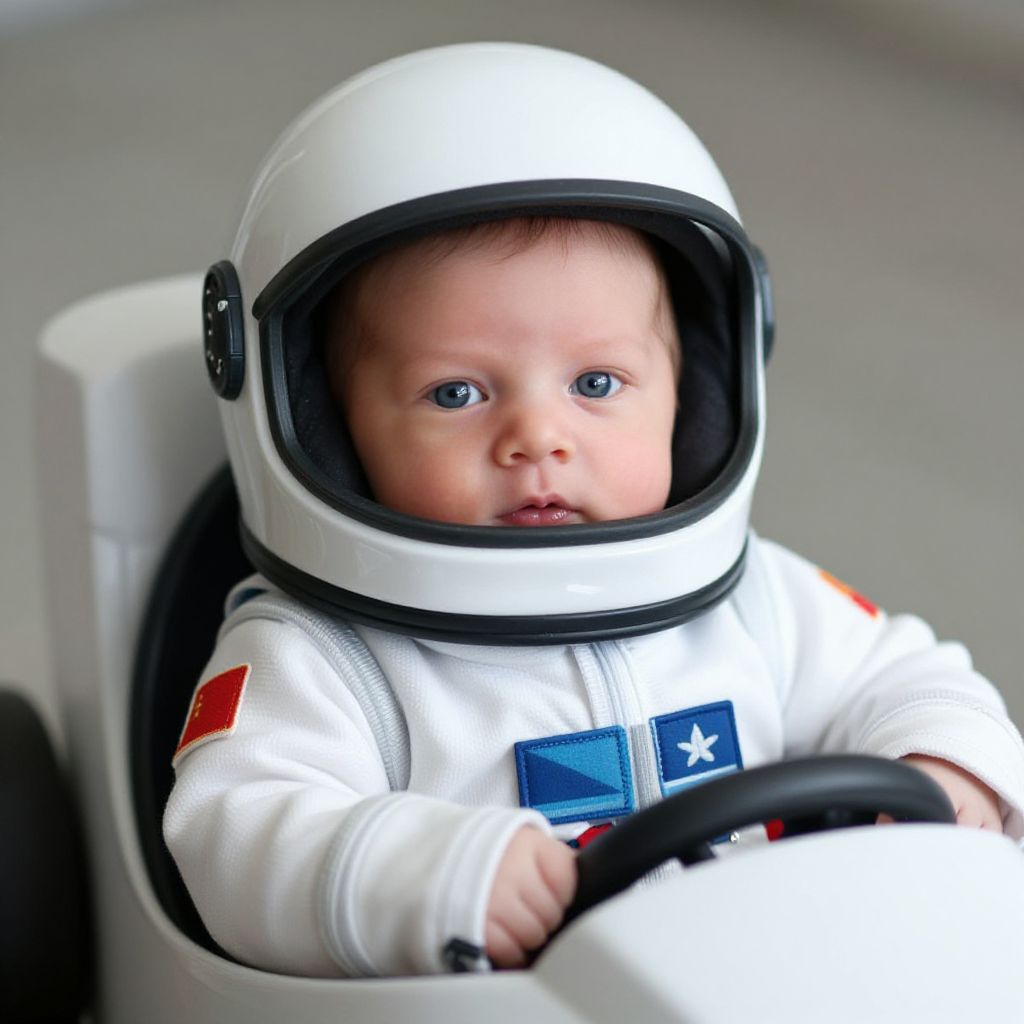 Photograph of a baby with fair skin and blue eyes, wearing a white astronaut helmet with a black visor and a white spacesuit with red and blue patches. The baby is seated in a white child-sized spaceship chair, gripping a black steering wheel with both hands. The background is blurred, focusing attention on the baby. The overall lighting is soft, highlighting the baby's innocent expression and the detailed textures of the spacesuit and helmet. The image conveys a playful, futuristic theme.