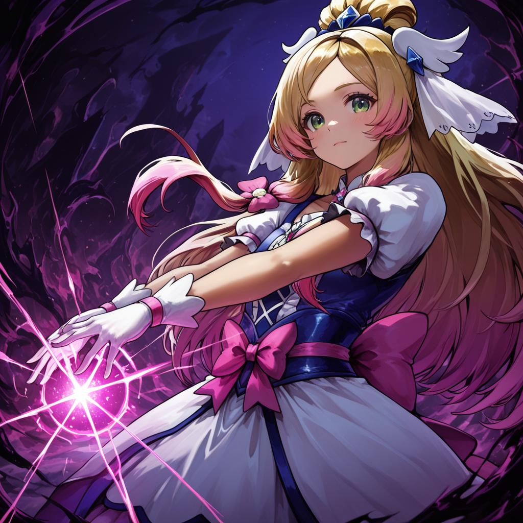Digital anime-style illustration of a magical girl with long blonde and pink two-tone hair, green eyes, and white gloves. She wears a blue and white dress adorned with pink bows, set against a dark swirling background as she projects a glowing pink magical energy from her hands.