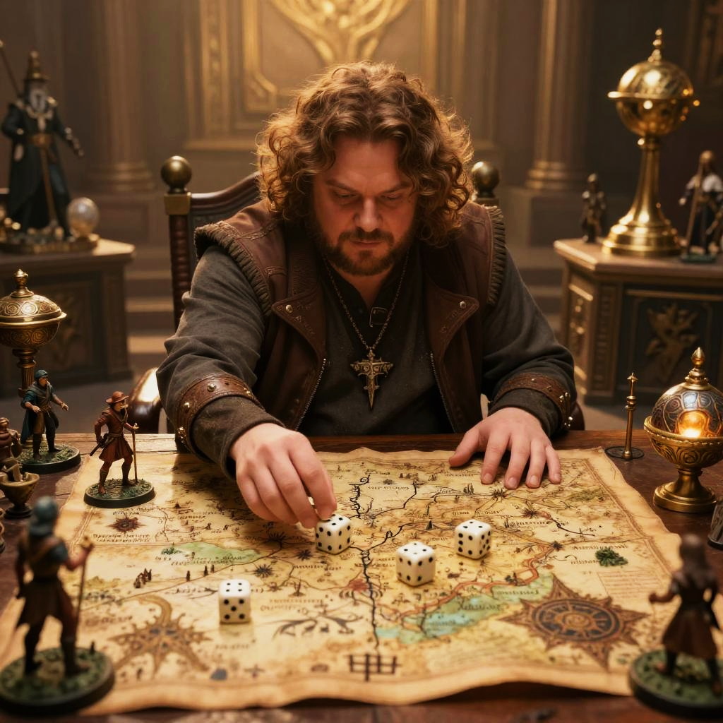 Photograph of a man with curly brown hair and a beard, wearing a dark brown, puffy-sleeved jacket with metal accents and a cross necklace. He is intently studying a large, detailed map on a wooden table, surrounded by various miniature figures, dice, and ornate brass lamps. The background features dark, ornate walls with gold accents and intricate patterns. The lighting is warm, creating a mystical, medieval ambiance. The man's focused expression and the rich textures of the map and objects convey a sense of deep concentration and strategic planning.