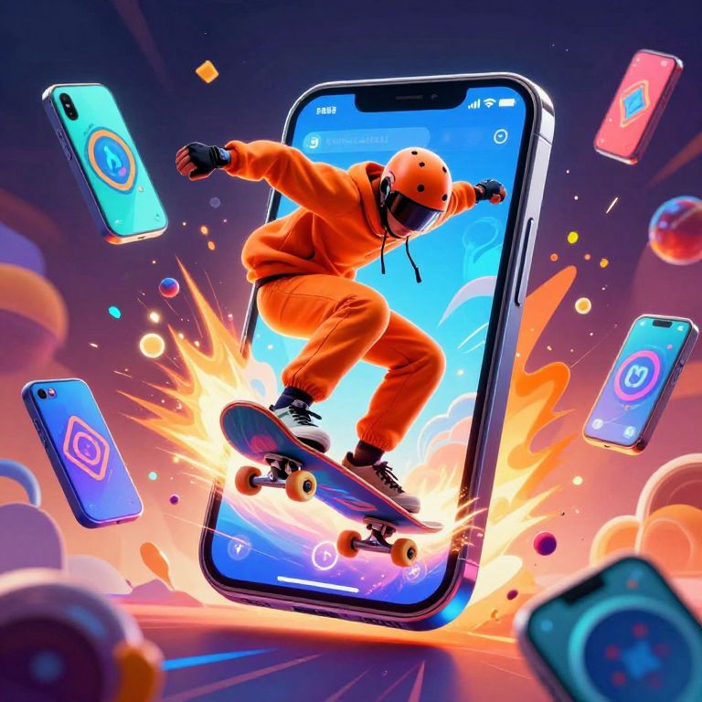 A vibrant digital illustration features a skateboarder wearing an orange hoodie, orange pants, and a black helmet, mid-trick on a smartphone. The phone, centered, has a bright blue screen with app icons and is surrounded by dynamic orange splashes. Floating smartphones with blue and pink screens are scattered around, enhancing the futuristic, energetic vibe. The background is a gradient of purple and blue, with colorful, abstract shapes adding to the motion and excitement. The skateboarder's stance is dynamic, with knees bent and arms outstretched, emphasizing the action and movement.
