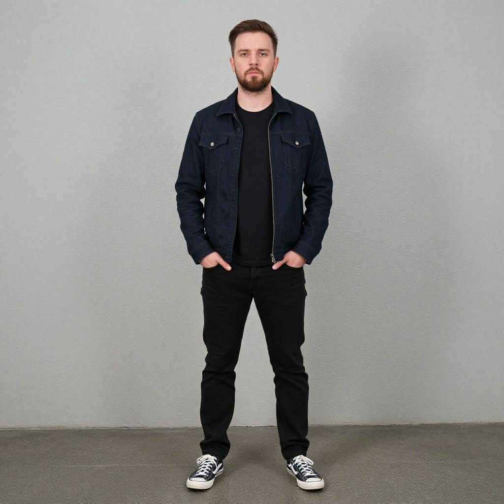Word pun costume, 1boy, solo, male focus, hands in pockets, facial hair, sneakers, shoes, jacket, full body, beard, pants, standing, shirt, black pants, looking at viewer, realistic, brown hair