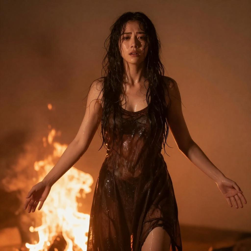 Young woman with long, wet, disheveled black hair wearing a soaked, dark sheer dress stands with arms slightly outstretched in front of a bright orange fire. Her expression is distressed, and the background has an intense orange glow from the flames.