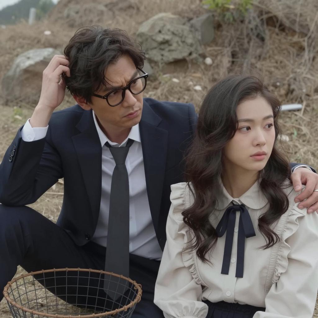 Profile view of an elderly Asian man and a young Asian woman standing face to face outdoors. The elderly man, wearing a white shirt and a blue polka dot bow tie, leans slightly forward with his eyes closed, almost touching noses with the young woman. The young woman wears a white button-up shirt and looks at him with a serious expression. The blurred background shows a tree and pink flowers, suggesting a park setting.