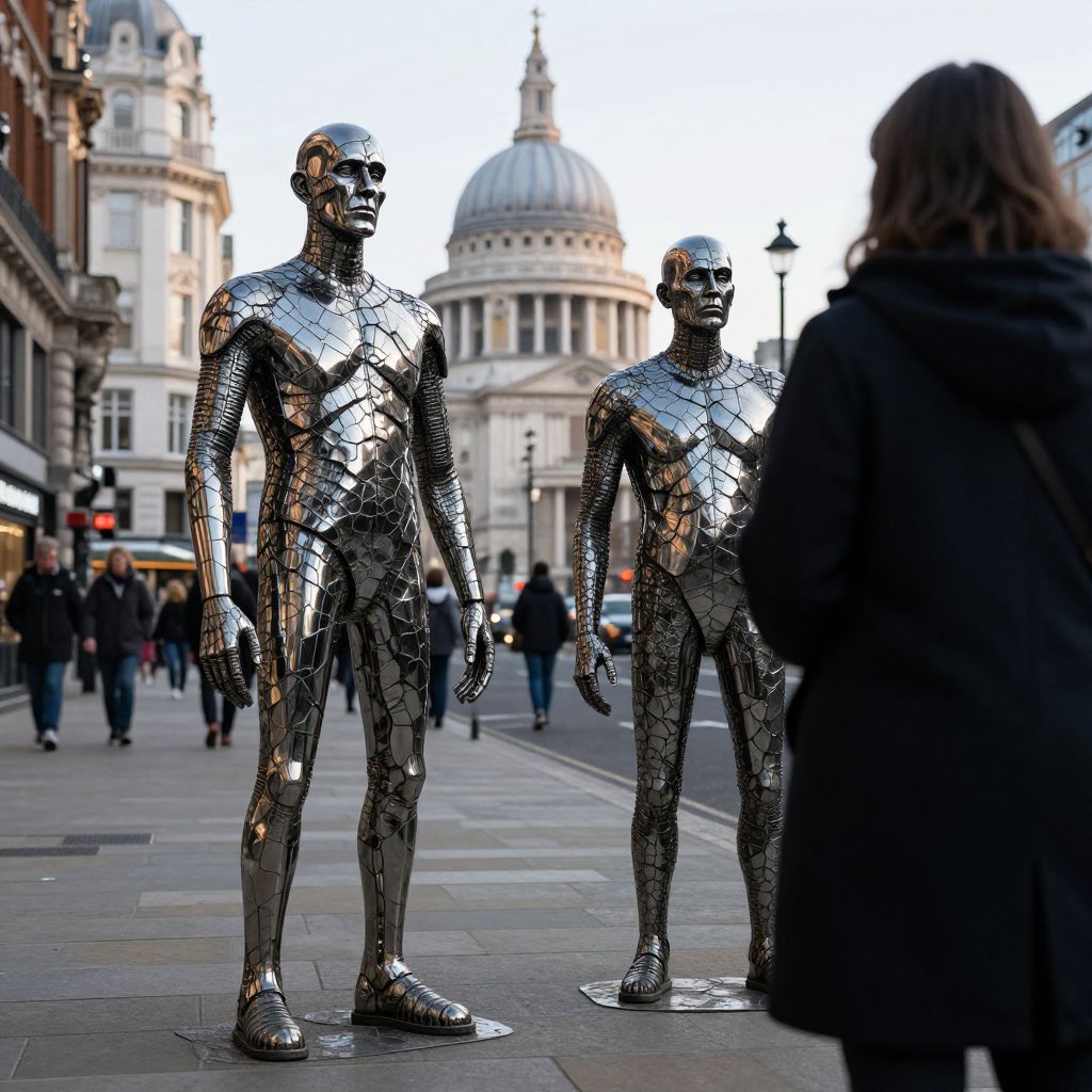 Two metallic golem-like figures stand on a bustling city street, their reflective, cracked surfaces mirroring the urban landscape and passersby, while a woman in a dark coat observes them from behind, her silhouette framed by the architectural backdrop of London's iconic dome.