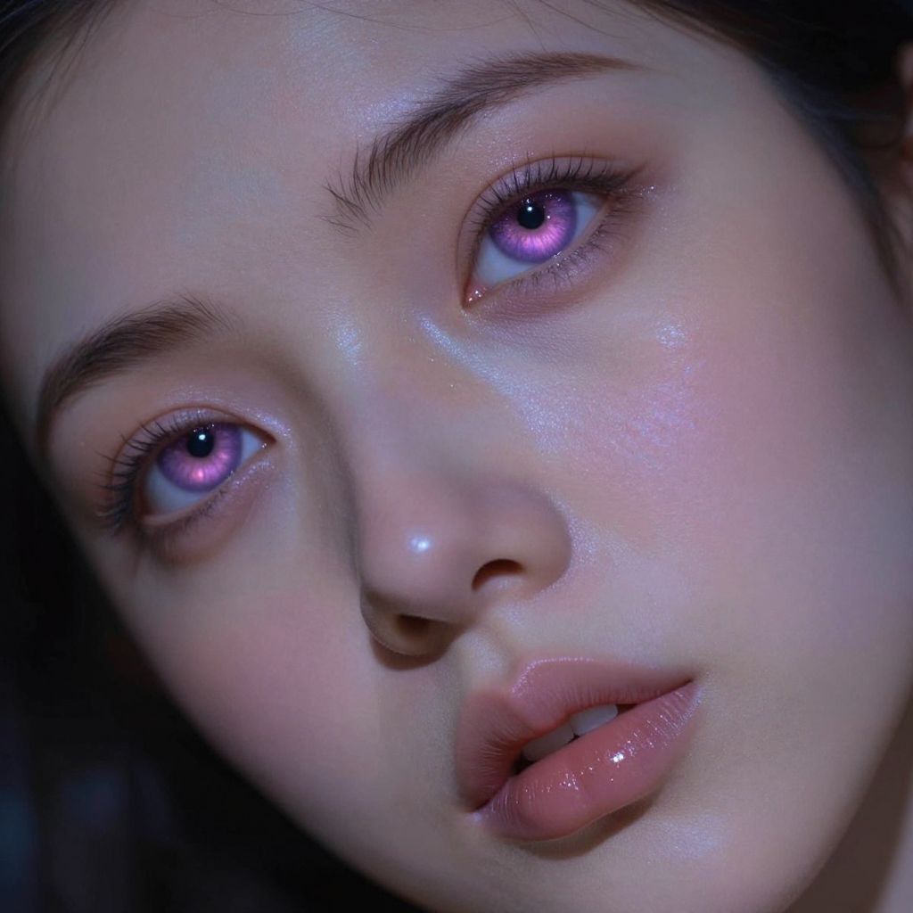 Digital portrait of a young woman with glowing, iridescent purple eyes, glossy pink lips, and smooth, luminous skin against a dark background.