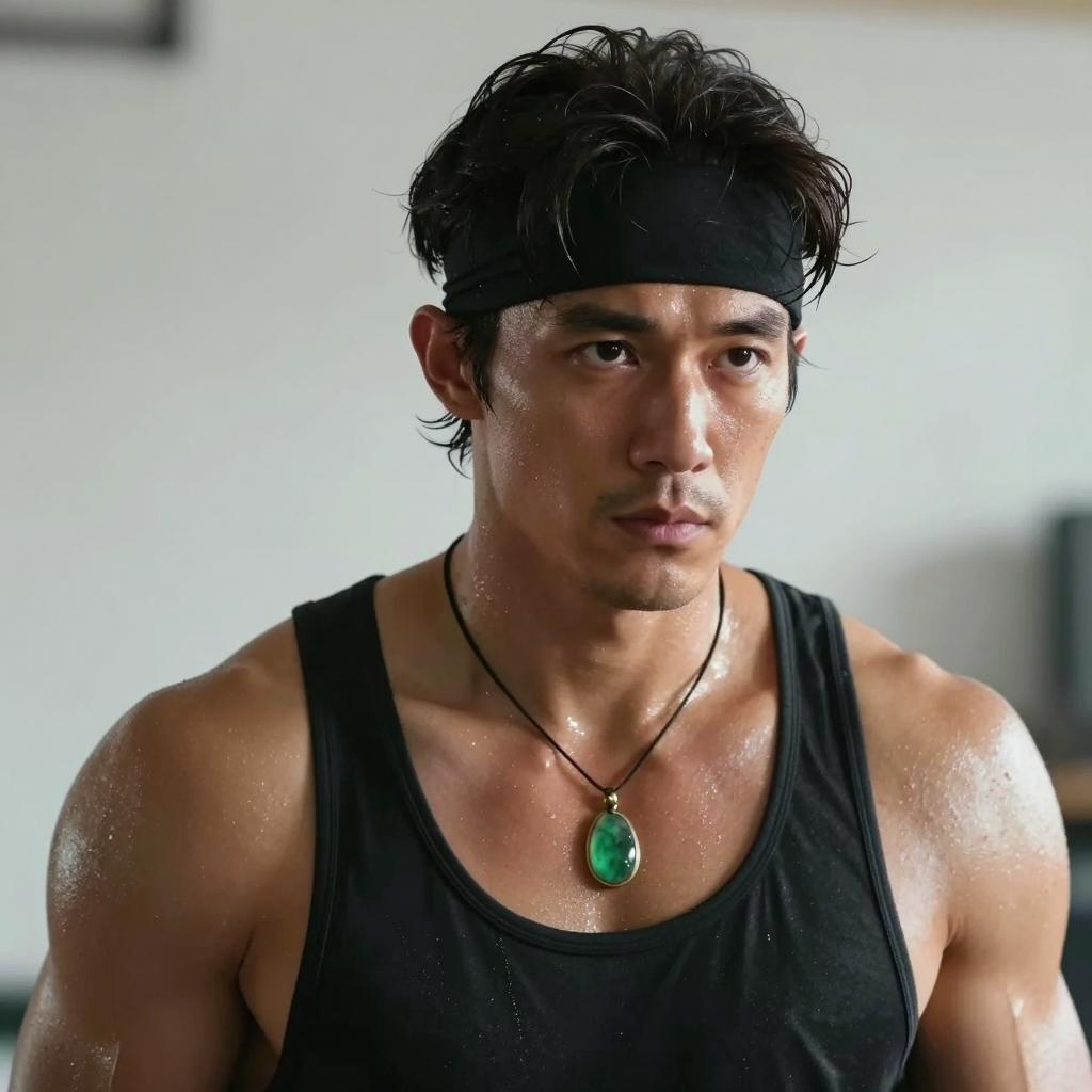 Photograph of a muscular man with a thick mustache, wearing a blue and turquoise armor-like suit with black straps. He is running and looking intensely forward, with a slightly open mouth. Background shows a wooden door and blurred interior.
