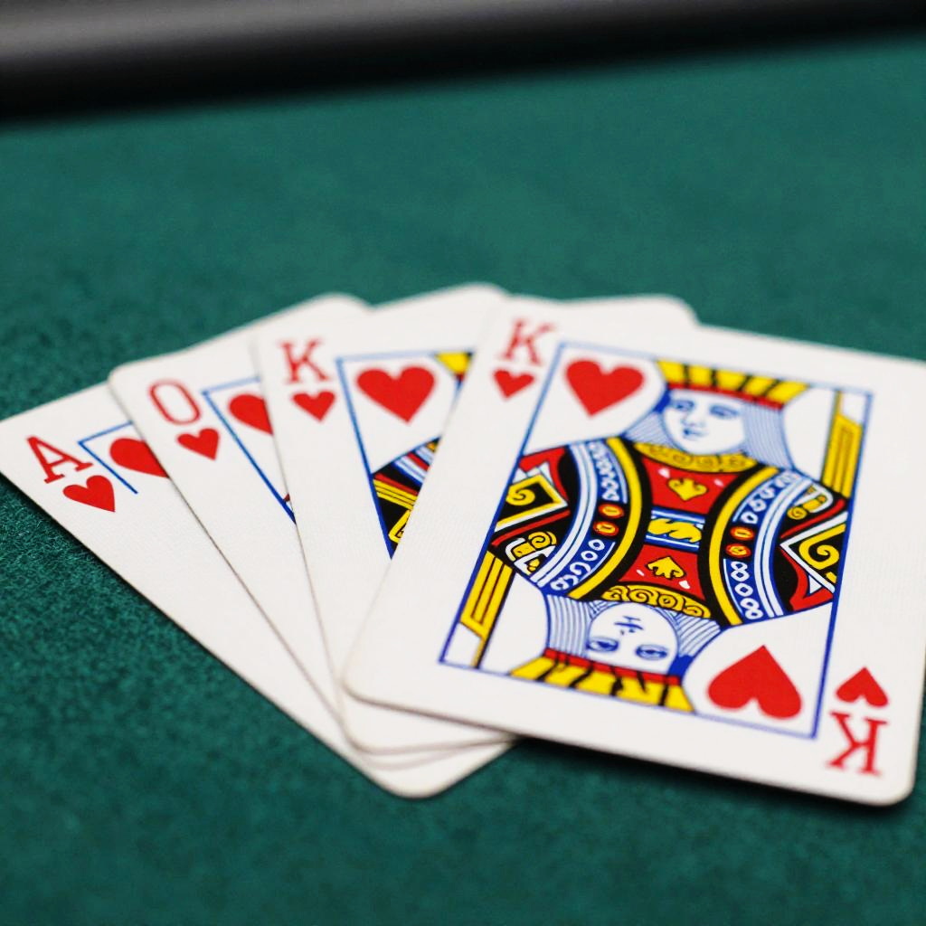 Photograph of five Ace of Hearts playing cards fanned out on a green poker table, with blurred poker chips in background.