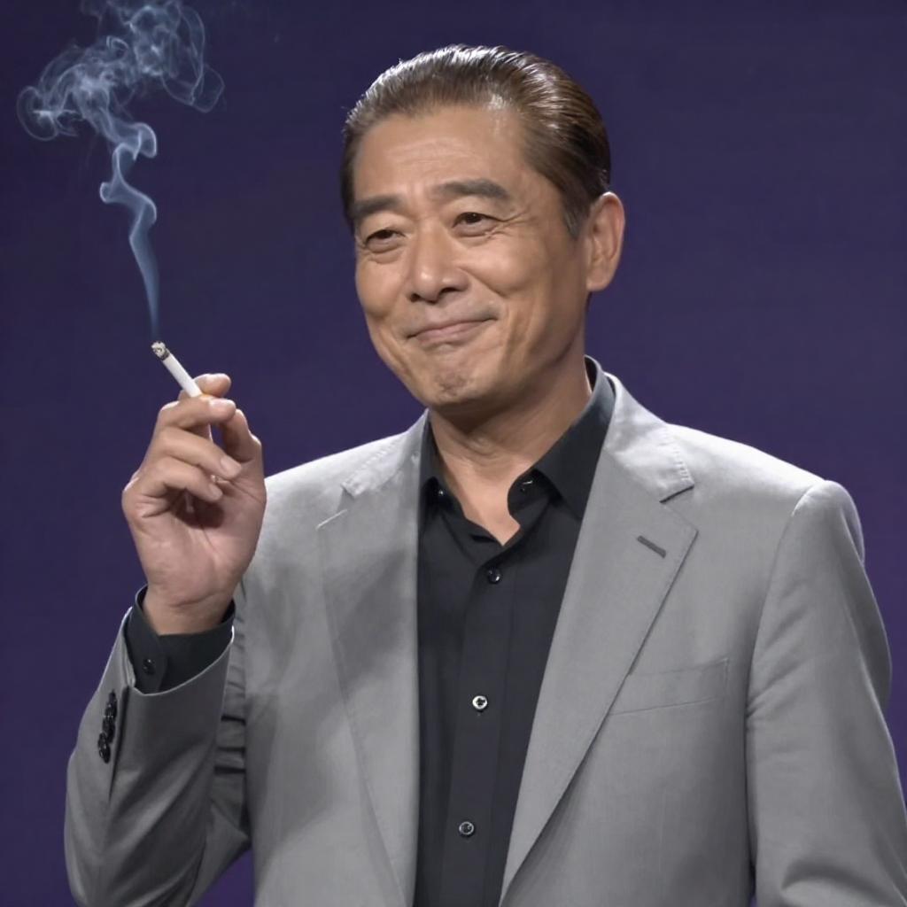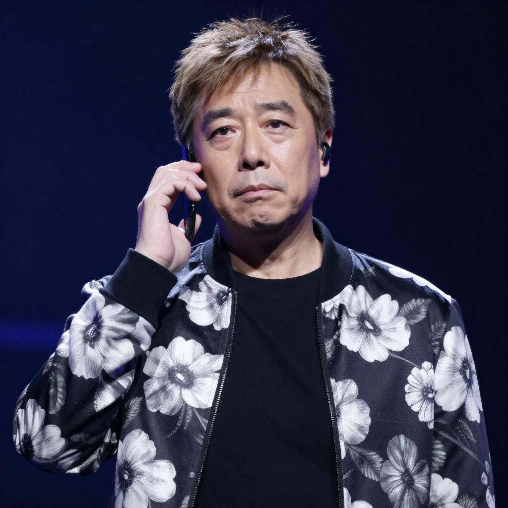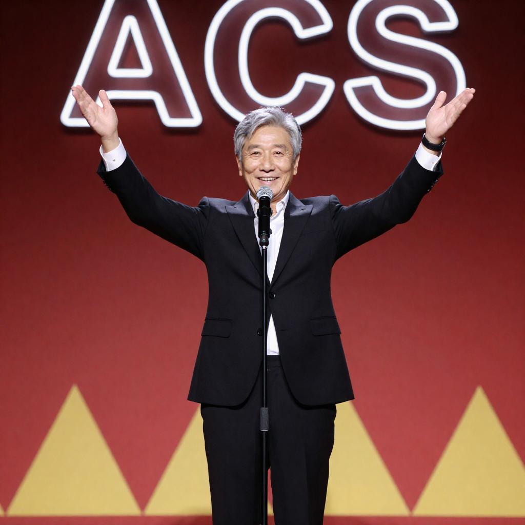 Photograph of a smiling man with gray hair, wearing a black suit and white shirt, holding a microphone in each hand. Arms raised, standing on stage with red background, illuminated neon "ACS" sign above. Yellow triangular pattern on stage floor. Bright lighting.