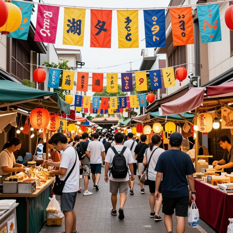 Vibrant street market photograph showing crowded alley with colorful Japanese flags, lanterns, and vendors selling food; people wearing casual summer clothes.