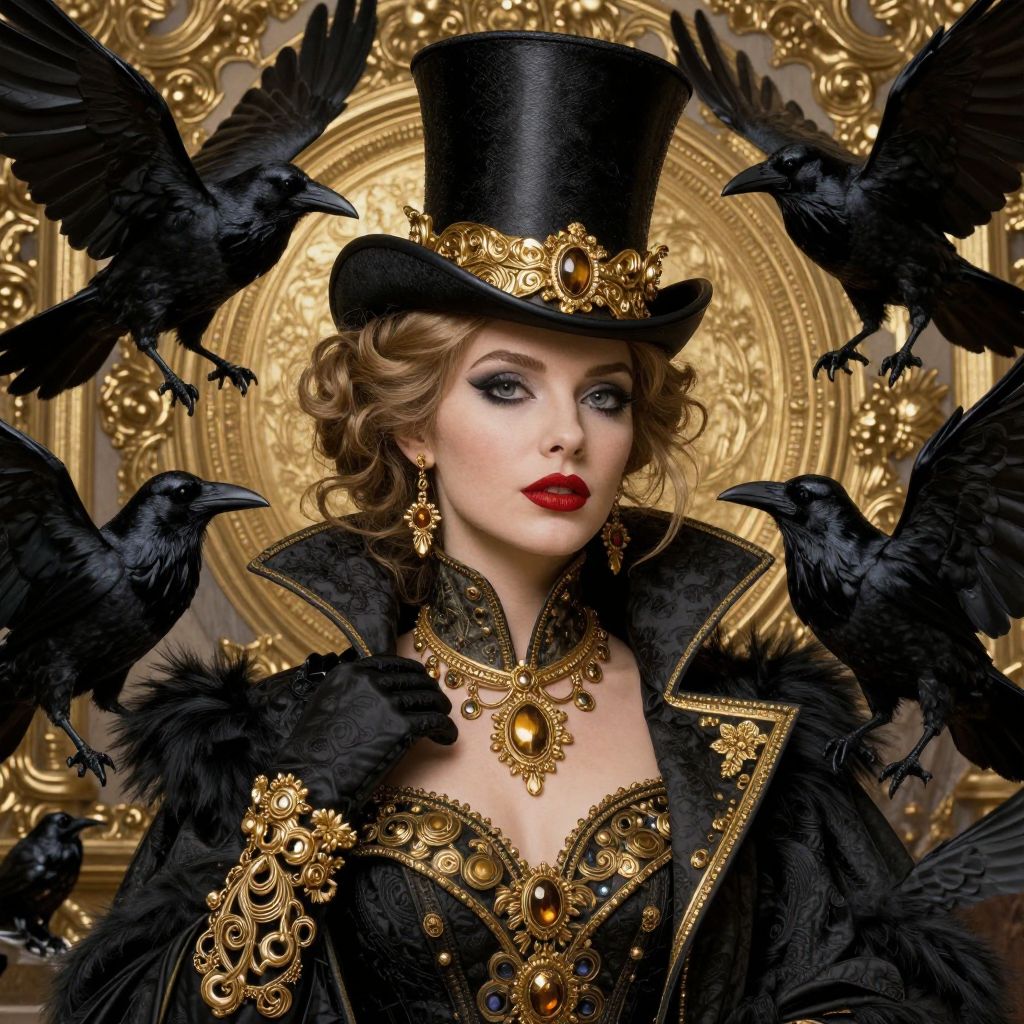 A highly detailed and intricate illustration of a woman adorned with ornate, golden accents, wearing a top hat and surrounded by ravens, creating a haunting and luxurious atmosphere.