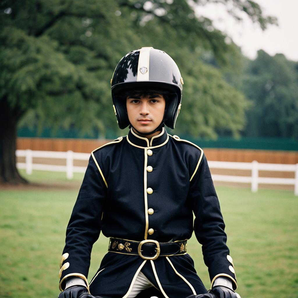Jockey fancy dress,helmet, male focus, 1boy, realistic, looking at viewer, tree, belt, blurry, outdoors, blurry background, horse, solo, black hair