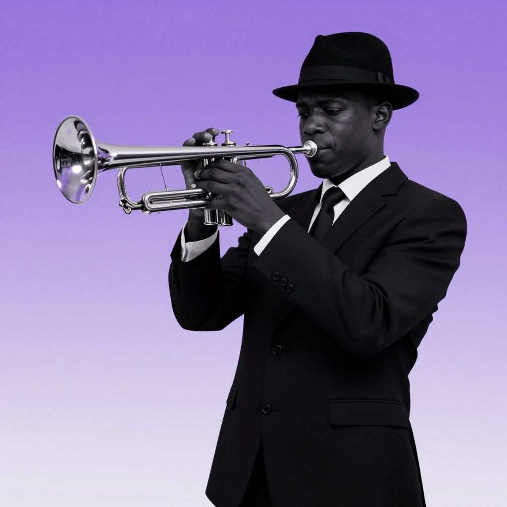 The image depicts a surreal, minimalist portrayal of a black man playing the trumpet, rendered in a striking combination of lavender and black hues. The figure is dressed in a sharp, tailored suit with a crisp white shirt and a black tie, exuding an air of sophistication and elegance. The man's fedora hat adds to the noir aesthetic, evoking a sense of mystery and intrigue. The trumpet, held with practiced ease, is the focal point of the composition, its curved form contrasting with the straight lines of the man's attire. The overall scene is set against a gradient background transitioning from a deep lavender at the top to a lighter shade at the bottom, creating a sense of depth and focus on the subject. The minimalist approach, combined with the use of monochromatic colors and the art deco-inspired design elements, gives the image a timeless quality, reminiscent of the 1950s jazz era. The composition is balanced, with the man and his instrument centrally positioned, drawing the viewer's eye directly to the act of playing the trumpet, a symbol of passion and expression.