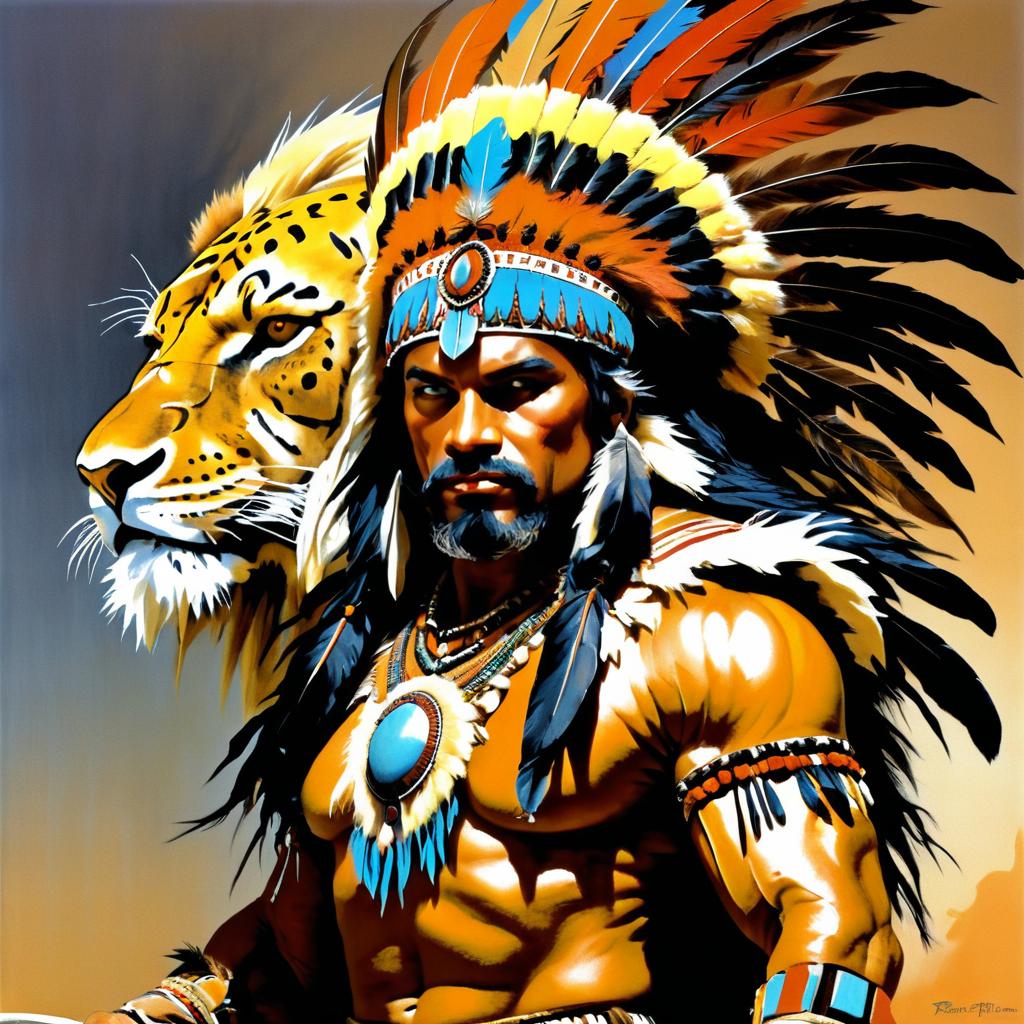 Artistic portrait of a fierce lion shaman, styled in tribal garments adorned with feathers, by Frank Frazetta, Boris Vallejo.
