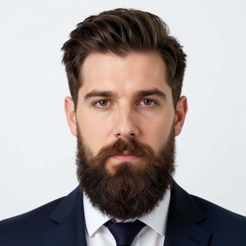 Add beard to photo of a professional headshot, studio setting, sharp focus, man wearing a suit, neatly groomed full beard, subtle highlights in hair, clean background, crisp detail emphasizing natural hair flow and skin texture.