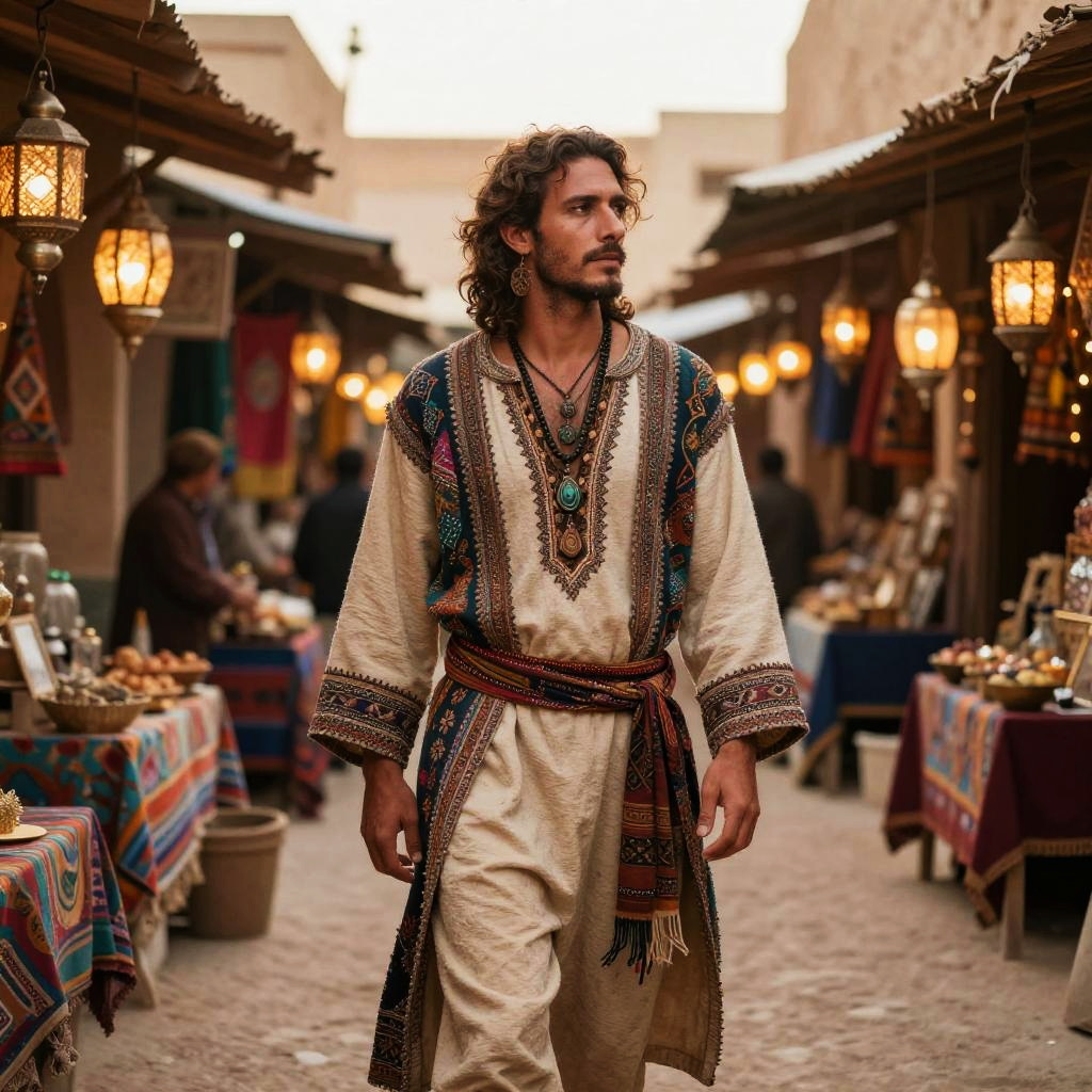 Gypsy male standing in a vibrant colorful marketplace, wearing traditional bohemian clothing with intricate patterns, surrounded by hanging lanterns and rustic stalls, warm golden hour lighting, highly detailed, cinematic