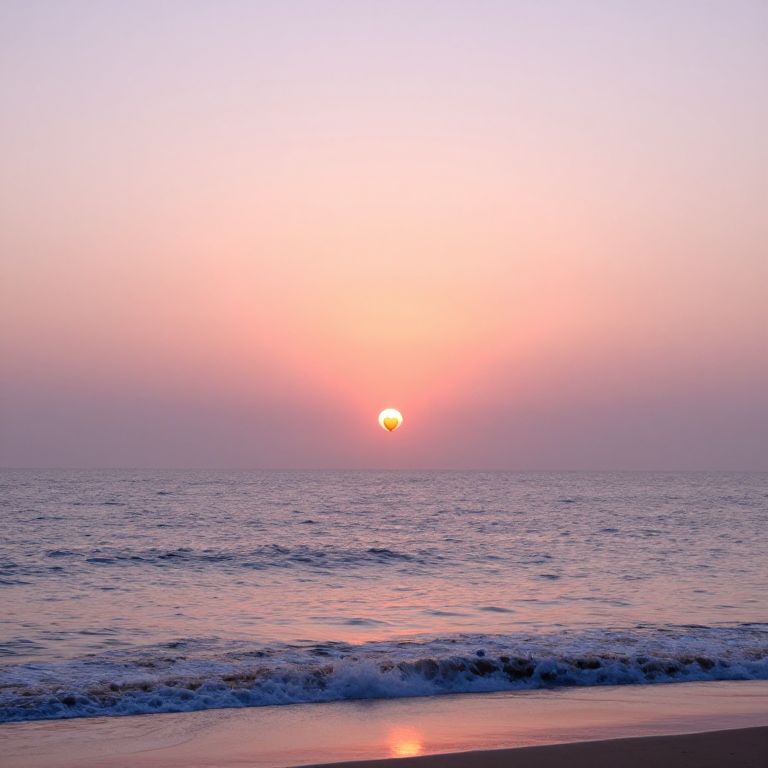 Photograph of a serene beach at sunset, with a pink and orange sky, a glowing sun on the horizon, gentle waves, and a reflective shoreline