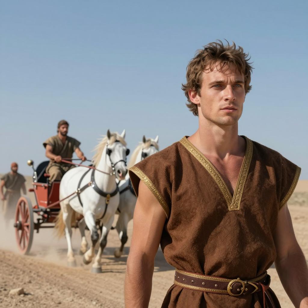 Young man with short brown hair and blue eyes dressed in a brown, V-neck ancient-style tunic with gold trim and belt stands in the foreground. In the desert background, a white two-horse chariot driven by a man is racing on a dusty path with two additional men nearby. Clear blue sky overhead.