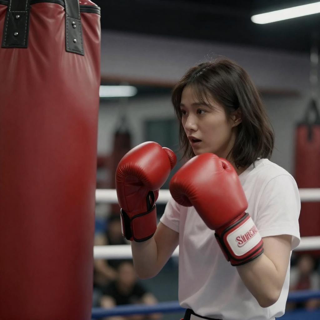 Photograph of a young woman with dark, shoulder-length hair, wearing a white t-shirt and red boxing gloves, standing in a boxing ring. She faces a red punching bag with a crown , her mouth slightly open, appearing focused. The background shows a dimly lit gym with blurred spectators.