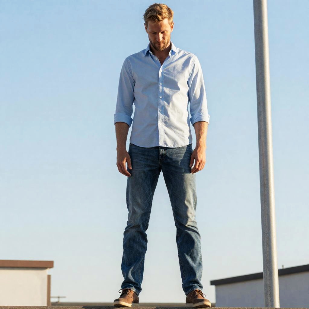 Photograph of a tall blond man wearing a light blue button-up shirt with rolled-up sleeves and blue jeans standing on a rooftop. He is looking down with his hands relaxed by his sides. The background features a clear blue sky and a metal pole to the right. Casual and relaxed stance.
