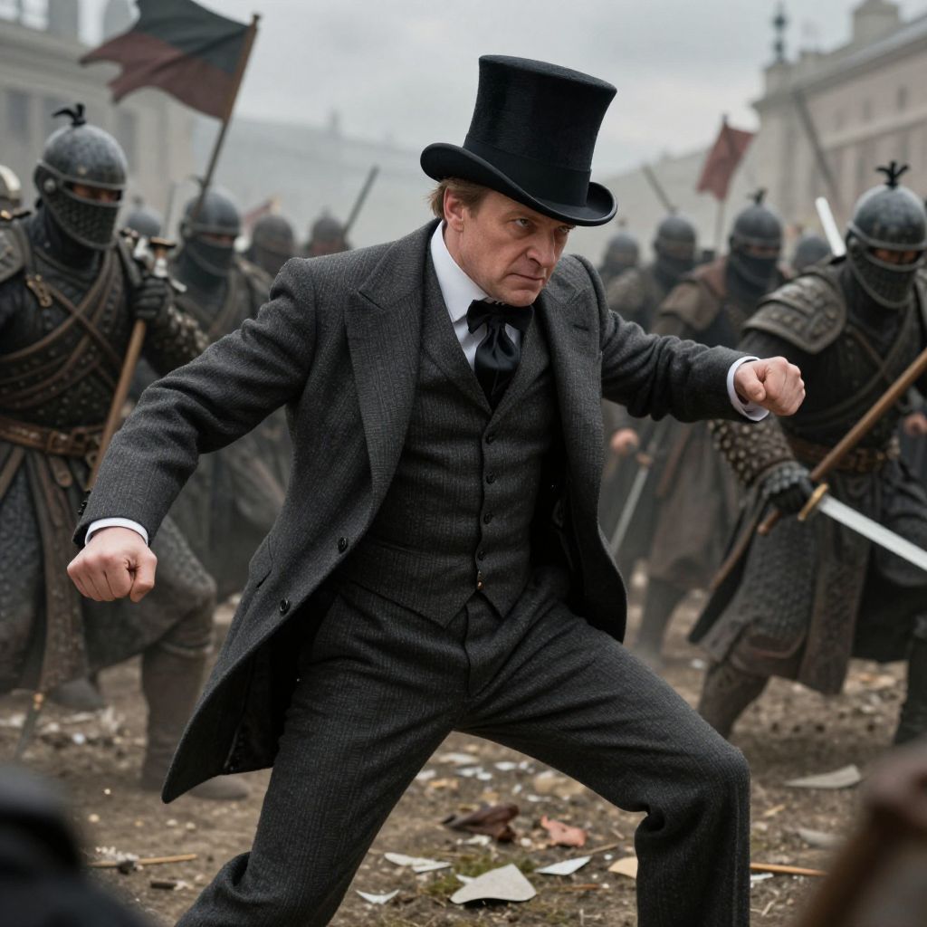 Cinematic artwork of middle aged man with a top hat and a fine suit fighting in battle against an army of warriors by greg rutowski, 4 k, fantasy, masterpiece