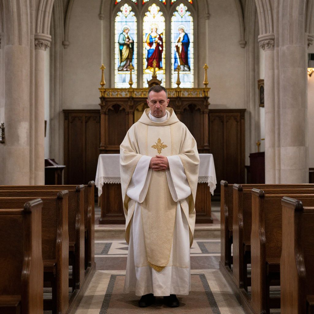 Photograph of a Catholic priest standing in the center aisle of a Gothic-style church. He is dressed in a cream-colored alb with a gold cross embroidered on the chest, and a matching stole. He has short brown hair and a solemn expression. The background features a large, colorful stained glass window with religious figures, and a wooden altar adorned with gold accents. Wooden pews line both sides of the aisle, and a white lace tablecloth is on the altar. The floor is tiled in a checkerboard pattern. The lighting is bright, highlighting the priest and the stained glass.