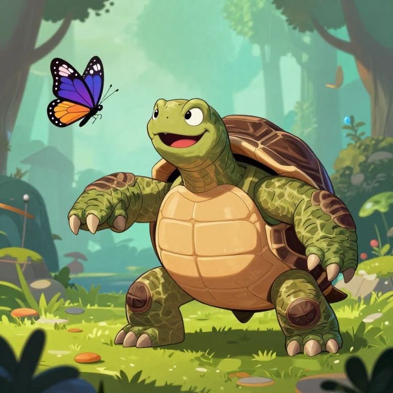 Illustration of a humanoid turtle barbarian with a dopey, smiling facial expression, chasing a brightly colored butterfly in a lush, sunlit forest. The turtle character has a large shell, green scaly skin, and a sturdy build, depicted in a fantasy style reminiscent of dungeons and dragons Tortle characters.