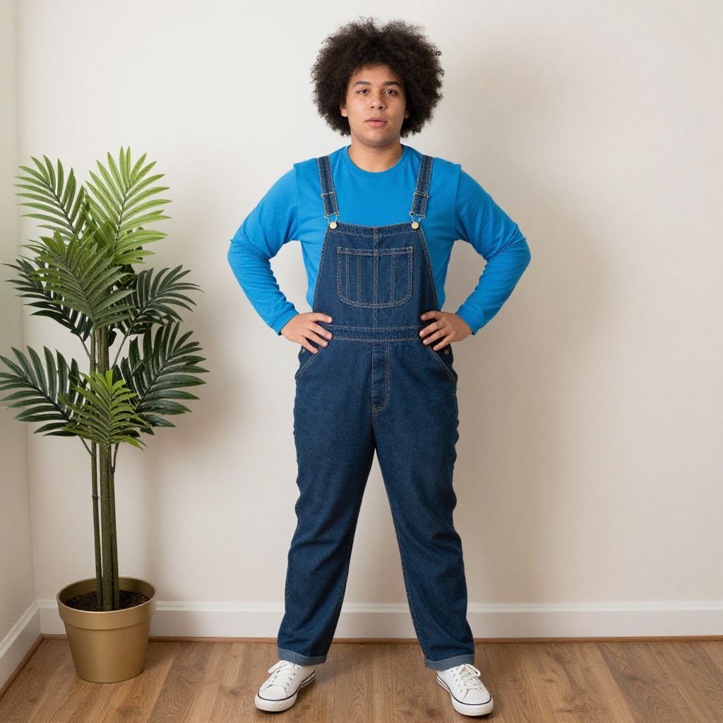 "plus size sour patch kid, 1boy, male focus, solo, afro, black hair, hands on own hips, blue shirt, looking at viewer, standing, full body, long sleeves, indoors, overalls, shirt, parody, potted plant Realistic photo of casual sexy person with pretty face"