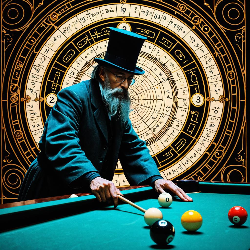 An elderly man with a long grey beard wearing a black top hat and dark coat is playing billiards. He is focused on his shot, holding a cue stick over a green pool table. Behind him is a large, ornate circular backdrop featuring intricate geometric patterns, ancient symbols, and mathematical inscriptions in gold and black tones, suggesting a fusion of mysticism, technology, and cosmology.