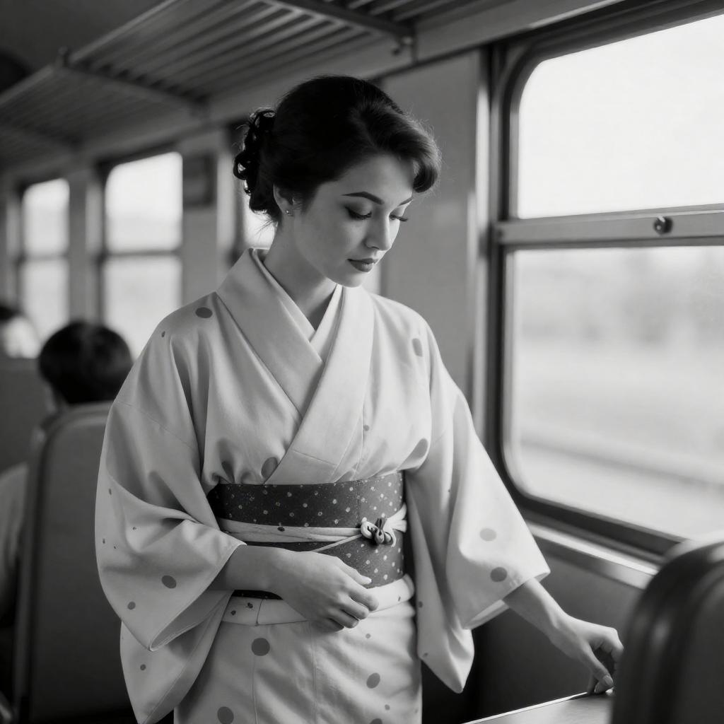 Black-and-white photograph of a woman with dark hair in a vintage pin-up style, wearing a polka-dotted kimono, standing inside a train. She looks down while adjusting a seat. Train window on the right shows a blurred outdoor landscape. Another person's back is partially visible on the left.