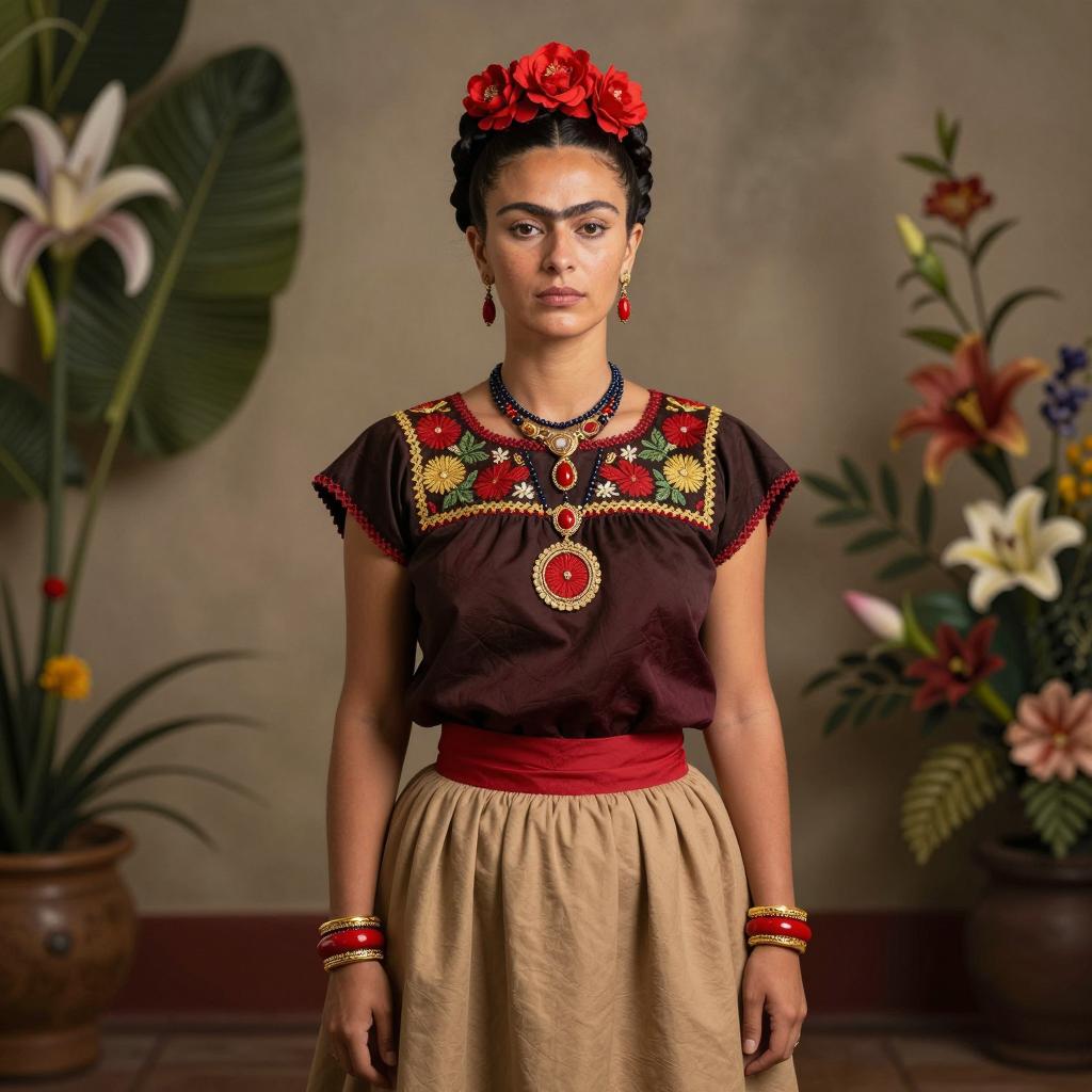 Spanish dress spain, photorealistic, young woman, standing, traditional red dress, detailed embroidery, puffed sleeves, yellow sash, red hair accessory, gold earrings, serious expression, narrow window to the left, beige wall, street lamp on right, daylight, slight shadow, Mediterranean style, realistic ures, warm colors