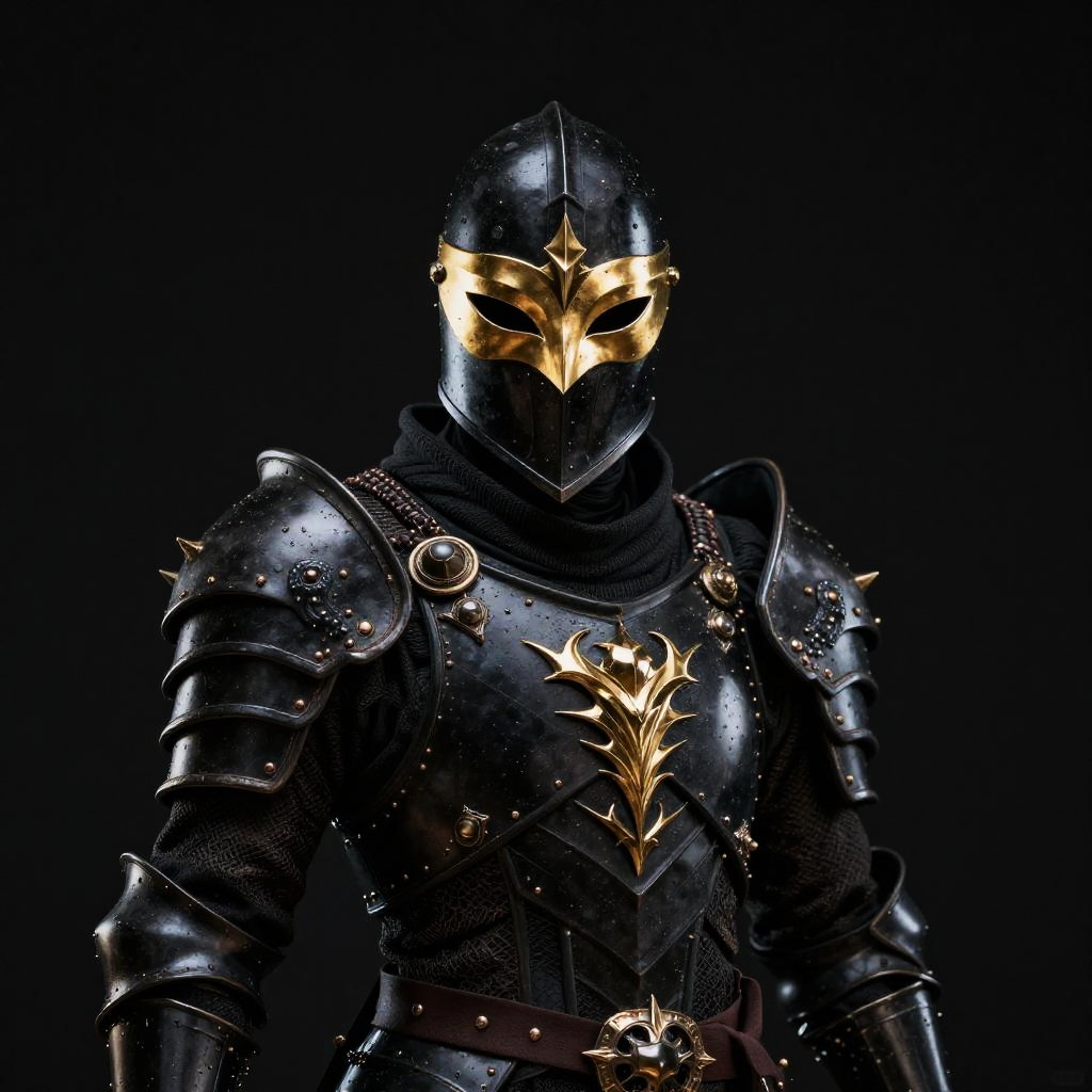 Gilded enchanted rogue with helmet and mask, all-black armor, intimidating face mask and helmet, plain black background, dark black theme, Panasonic Lumix S, dramatic, complex details, professional photography, 8k, photo-realistic, octane rendering, global illumination, RTX ray tracing, VFX post-processing